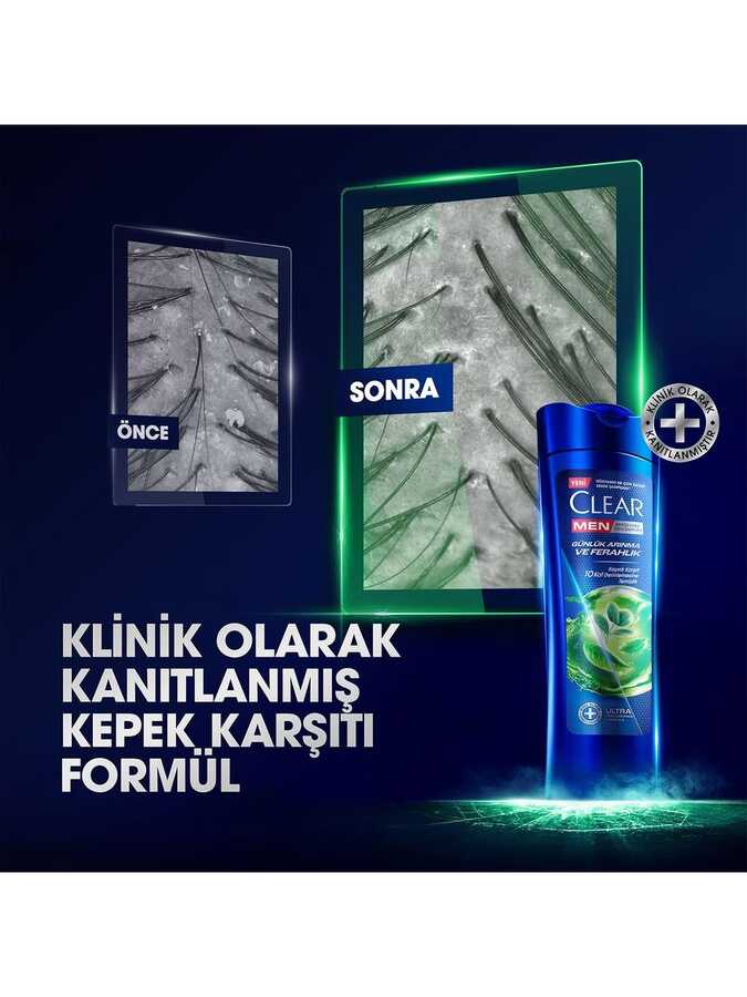 Erkeklerin saç derisi, yapısal olarak kadınlardan farklıdır. Bu farklılık, saç derisinin kepek, yağlanma ve kaşıntıya daha yatkın olmasına neden olur. Ancak Clear Men Günlük Arınma ve Ferahlık Kepeğe Karşı Etkili Şampuan, erkek saç derisi için özel olarak tasarlanmış bir formüle sahiptir. Baştan aşağı yenilenen özel formülü sayesinde, kepeğe karşı %100 koruma** sağlar ve 10 kat derinlemesine temizlik ile kaşıntıya karşı rahatlama sağlar. Dünyanın 1 numaralı erkek şampuanı* olan Clear Men, kepeğe ve yağlanmaya karşı 10 kat derinlemesine temizlik sunar. Niasinamid, sedir ağacı ve okaliptus özleri içeren formülü ile, saç derinizi beslerken, her yıkamada ferahlık hissi verir. Clear'ın klinik olarak kanıtlanmış bu kepek karşıtı formülü, düzenli kullanıldığında gözle görünür kepeği önlemeye yardımcı olur. Yenilenen Clear Men, saç bakımında devrim yaratmaya devam ediyor. Türkiye'de Clear kullanıcıları arasında yapılan tüketici testine göre kullananların %96'sı, Clear'ın saç derisindeki ferahlatıcı ve rahatlatıcı etkisini onaylıyor***. Kepeğe karşı etkili bir çözüm sunan ve kaşıntıya karşı rahatlama sağlayan Clear Men Günlük Arınma ve Ferahlık Kepeğe Karşı Etkili Şampuan’ı deneyin. *Temmuz 2022 – Haziran 2023 Nielsen perakende endeksine göre raporlanan hacimsel satış verileri baz alınmıştır. **Düzenli kullanıldığında gözle görünür kepeği önlemeye yardımcı olur. ***Türkiye'de Clear kullanıcıları arasında yapılan tüketici testine dayanarak. Kullanım: Islak saç ve saç derisine uygulayın, saç derisine masaj yapın ve durulayın. En iyi sonucu almak için her gün kullanın. Gözle temas halinde bol suyla durulayın. Doğrudan güneş ışığından uzak, serin bir yerde saklayın. İçindekiler: Aqua, Sodium Laureth Sulfate, Cocamidopropyl Betaine, Sodium Chloride, Parfum, Sodium Benzoate, Menthol, Dimethiconol, Piroctone Olamine, Citric Acid, Carbomer, Dimethicone, Guar Hydroxypropyltrimonium Chloride, Sodium Hydroxide, Mica, Helianthus Annuus (Sunflower) Seed Oil, Acrylamidopropyltrimonium Chloride/Acrylamide Copolymer, Disodium EDTA, Glycerin, TEA-Dodecylbenzenesulfonate, TEA-Sulfate, Glycine, Niacinamide, Laureth-23, Poloxamer 407, PPG-9, Phenoxyethanol, Laureth-4, PEG-4, Propylene Glycol, Taurine, Xanthan Gum, Cedrus Atlantica Wood Extract, Eucalyptus Globulus Leaf Extract, Benzyl Salicylate, Hexyl Cinnamal, Limonene, Linalool, CI 42090, Cl 77891.Daha fazla gör Daha az gör