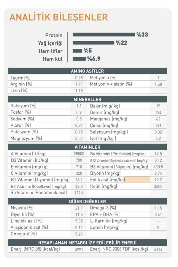 Analitik Bileşenleri: Protein: %33 - Yağ: %22 - Kül: %6,9 - Diyetsel lif: %5 - Her kg için: Omega 3 yağ asidi: 11,5 g - Omega 6 yağ asitleri: 52,9 g.