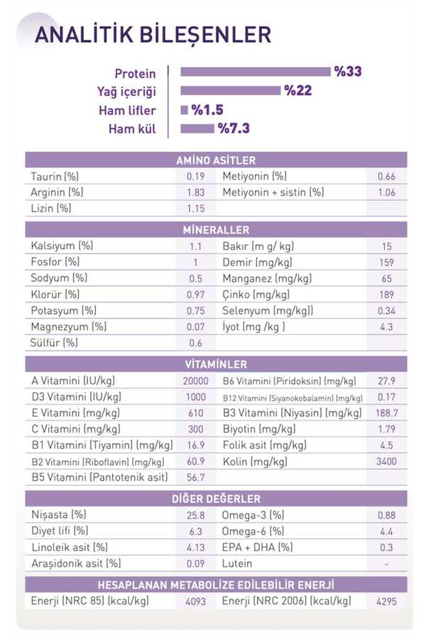 Kurutulmuş kümes hayvanları eti, pirinç, mısır, kümes hayvanları yağı, mısır glüten, kümes hayvanları karaciğeri, kurutulmuş kümes hayvanları proteini, bitkisel yağ, pancar küspesi, maya, mineraller, bitkisel lifler, balık yağı, frukto-oligo-sakkaritler, DL-metiyonin, iz elementler, sodyum fosfat, yumurta tozu, taurin, vitaminler.
