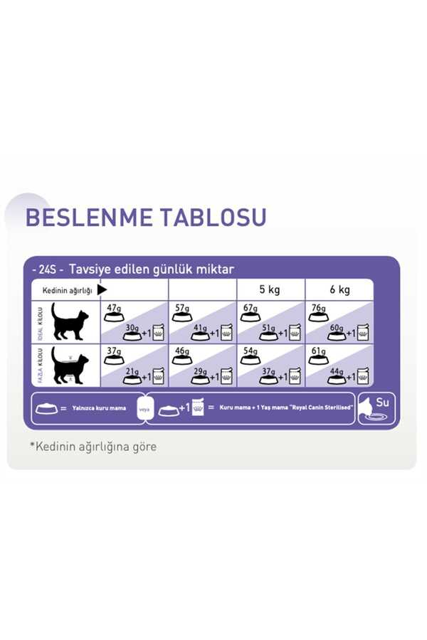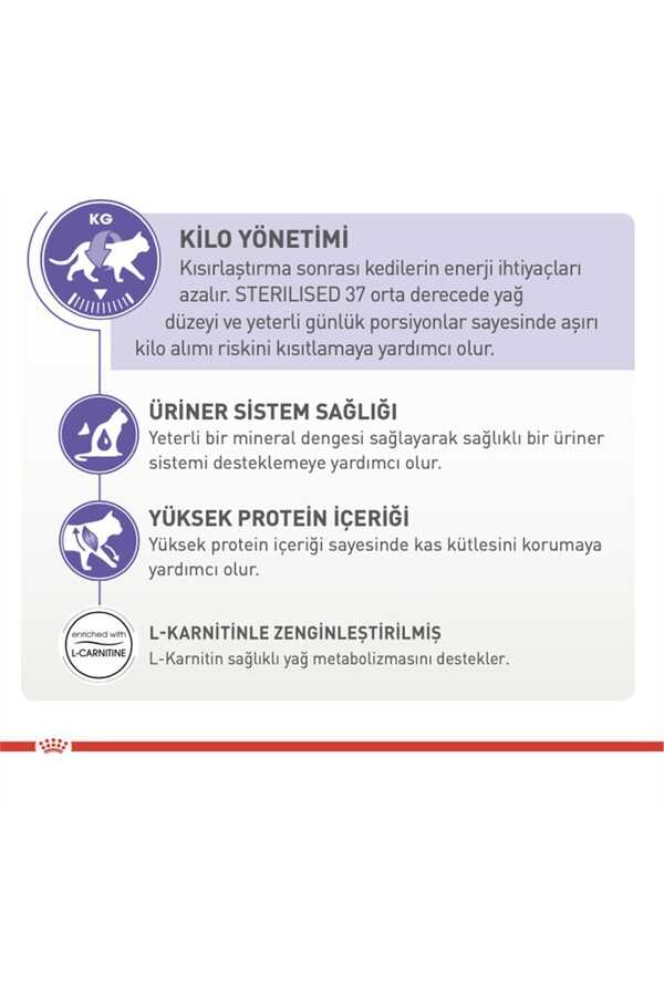 Kedinizin kısırlaştırıldıktan sonra, tükettiği besinlerin değişen enerji ihtiyacını desteklemesini sağlamak için bir diyet değişikliği gerekebilir. ROYAL CANIN® Sterilised 37 uygun miktardaki yağ oranıyla, kedinizin kısırlaştırmadan sonra ideal vücut ağırlığını korumasına yardımcı olur. ROYAL CANIN® Sterilised 37 mama ayrıca kedinizin üriner sisteminin sağlığını desteklemeye ve korumaya yardımcı olan dikkatle belirlenmiş bir mineral dengesine sahiptir; bu mamadaki yüksek protein içeriği kedinizin sağlıklı kas kütlesini korumaya yardımcı olur. Her kedinin farklı tercihlerine hitap etmek için ROYAL CANIN® Sterilised 37, gravy veya jelly yaş mama seçenekleri olarak da mevcuttur. Karıştırarak besleme uygularken, kedinizin uygun miktarda yaş ve kuru mama alıp maksimum faydayı elde ettiğinden emin olmak için besleme kılavuzumuzu uygulayın.