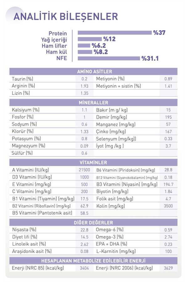 BİLEŞİM: Kurutulmuş kümes hayvanı proteini, mısır, bitkisel proteinizolatı*, bitkisel lifler, hayvansal yağlar, hidrolize hayvansal proteinler, pirinç, buğday, pancar küspesi, mısır gluteni, mayalar ve ilgili kısımlar, mineraller, balık yağı, frukto-oligosakkaridler, soya yağı.Katkı Maddeleri (kg başına)Besin katkıları: A Vitamini: 19000 IU, Vitamin D3: 1000 IU, E1 (Demir): 31 mg, E2 (İyot): 3,1 mg, E4 (Bakır): 10 mg, E5 (Manganez): 41 mg, E6 (Çinko): 122 mg, E8 (Selenyum): 0,05 mg- L-karnitin: 100 mg - Teknolojik katkı maddeleri: Tortul kaynaklı klinoptilolit: 10 gr - Zooteknik katkı maddeleri: Amonyum klorür: 5 gr - Koruyucular - Antioksidanlar Protein: 37% - Yağ : 12% - Ham kül: 8.2% - Ham lif: 6.2%. *L.I.P.: Yüksek sindirilebilir protein.